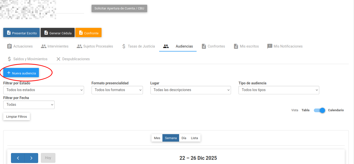 - Audiencias del Expediente: Muestra solo las audiencias relacionadas con el caso actual. Ideal para no superponer eventos dentro del mismo proceso.