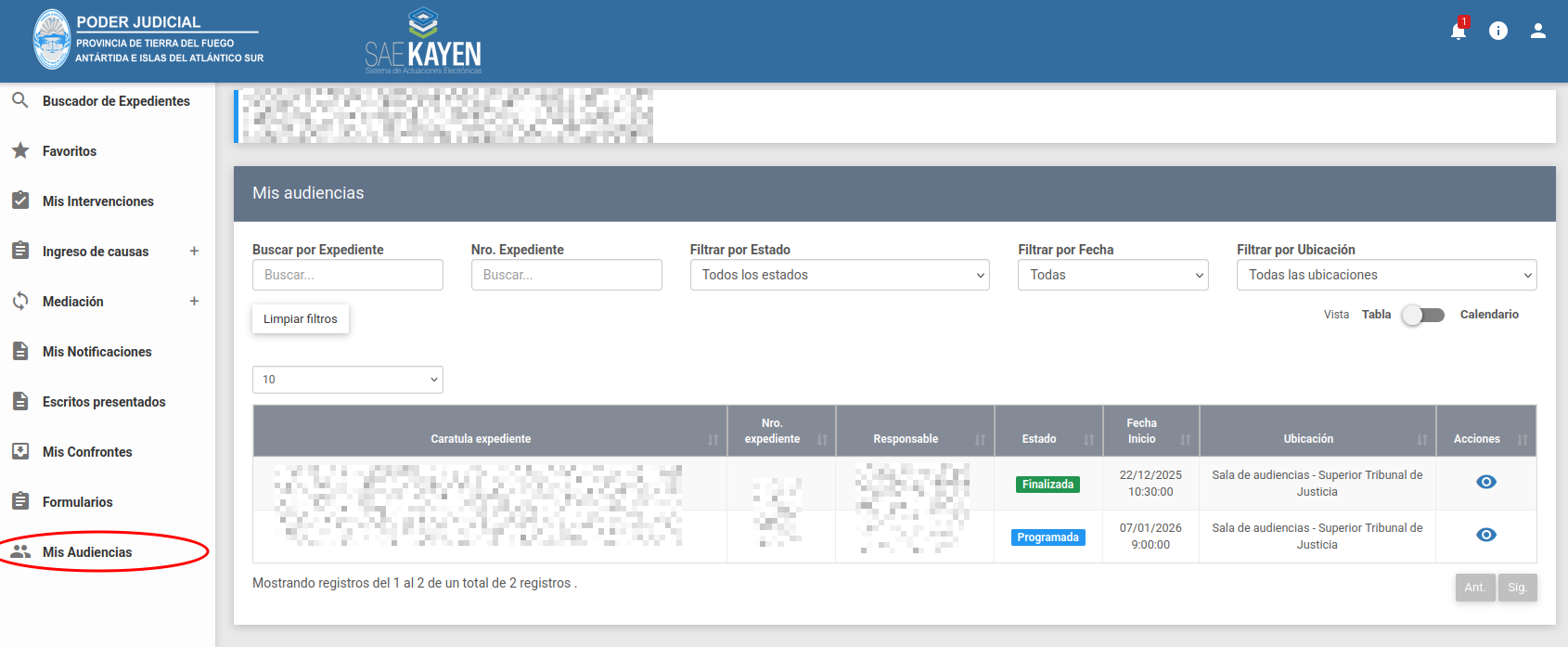 Esta página tiene una funcionalidad similar a Mis audiencias pero se muestran las audiencias en donde se encuentra involucrado como empleado del organismo. Es importante destacar que para usuarios que posean acceso a múltiples organismos, solamente podrán observar las audiencias para el organismo que se encuentre seleccionado en el momento.