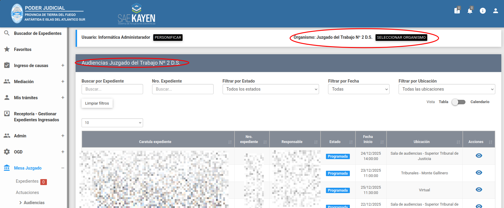 - Audiencias del Organismo: Visualiza todas las audiencias programadas por el organismo. Esta vista es fundamental para conocer la carga de trabajo general y evitar cuellos de botella.