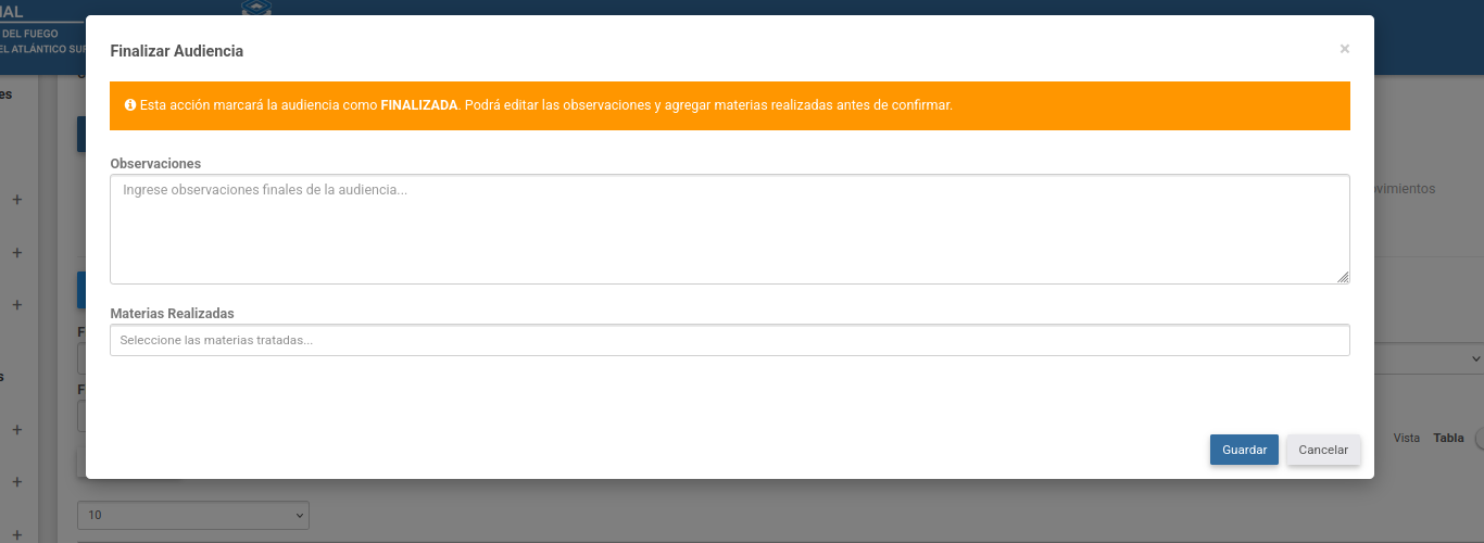 Dentro de la columna acciones se encuentra un botón para marcar la audiencia como finalizada la cual abrirá un modal donde se podrán registrar (opcionalmente) observaciones sobre la misma y las materias que fueron tratadas.
