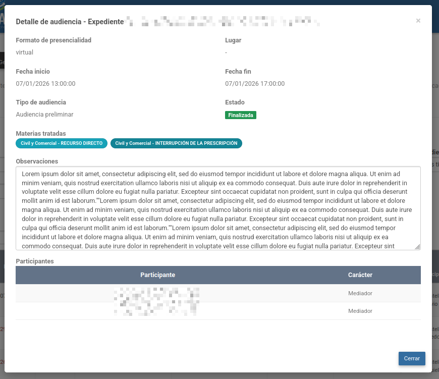 - Tipo de audiencia (filtrado por fuero)
