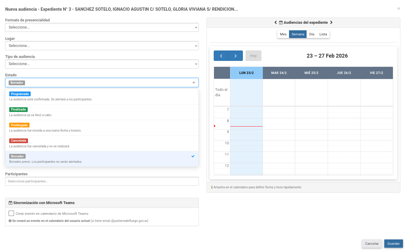 Dentro de las opciones del formulario se encuentra la casilla Sincronización con Microsoft Teams, la cual permite crear automáticamente un evento/reunión asociado a la audiencia en Microsoft Teams (calendario del usuario creador), invitando a los participantes informados. Esta opción se encuentra disponible únicamente para usuarios con dominio @justierradelfuego.gov.ar. Alcance (qué se genera):