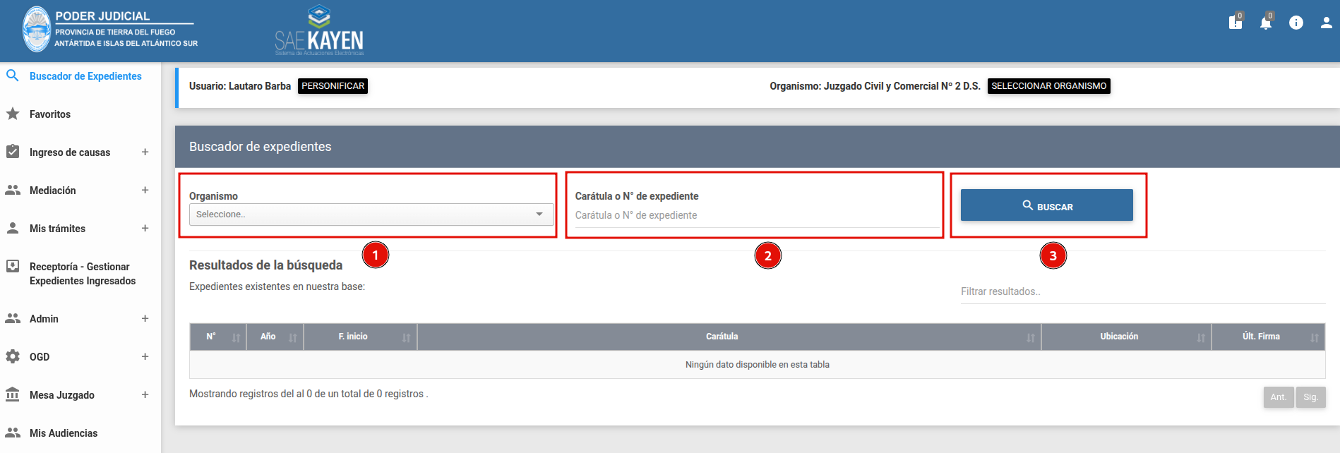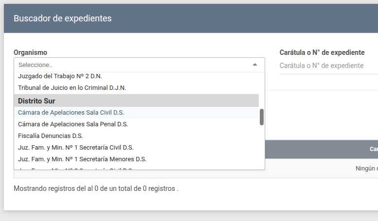Selector de Organismo: Permite filtrar la búsqueda por la dependencia judicial específica.