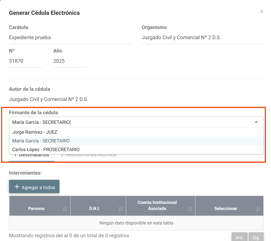 Al ingresar, el sistema muestra una advertencia indicando que los usuarios listados tendrán acceso a los expedientes del juzgado. Por lo tanto, solo debe asignarse personal autorizado.