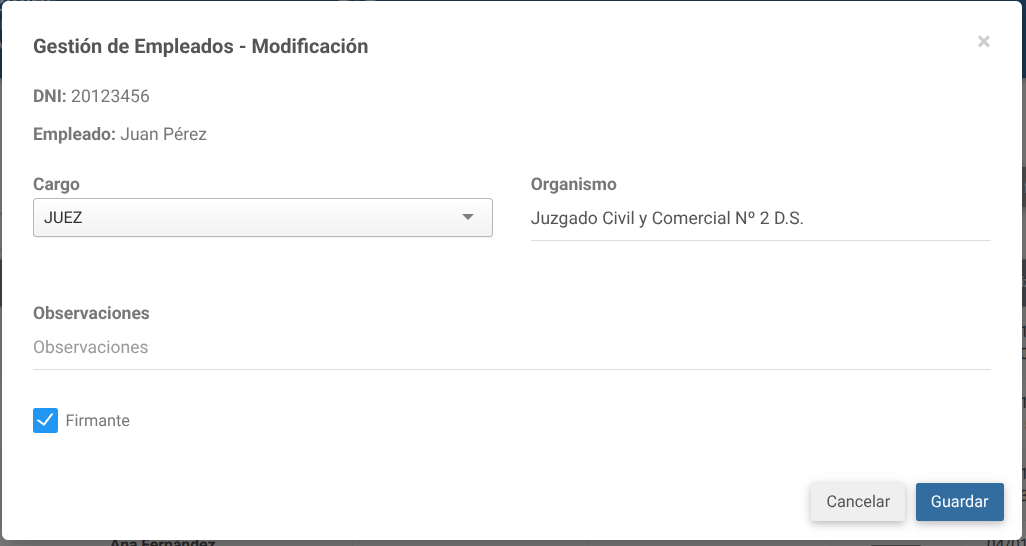 - Editar: modificar cargo, observaciones y condición de firmante.
