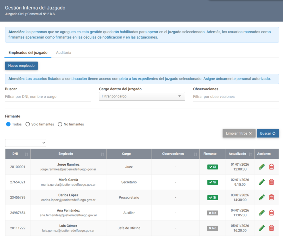 Desde esta pantalla se definen los accesos operativos, los firmantes habilitados y se puede auditar toda la actividad realizada dentro del juzgado.