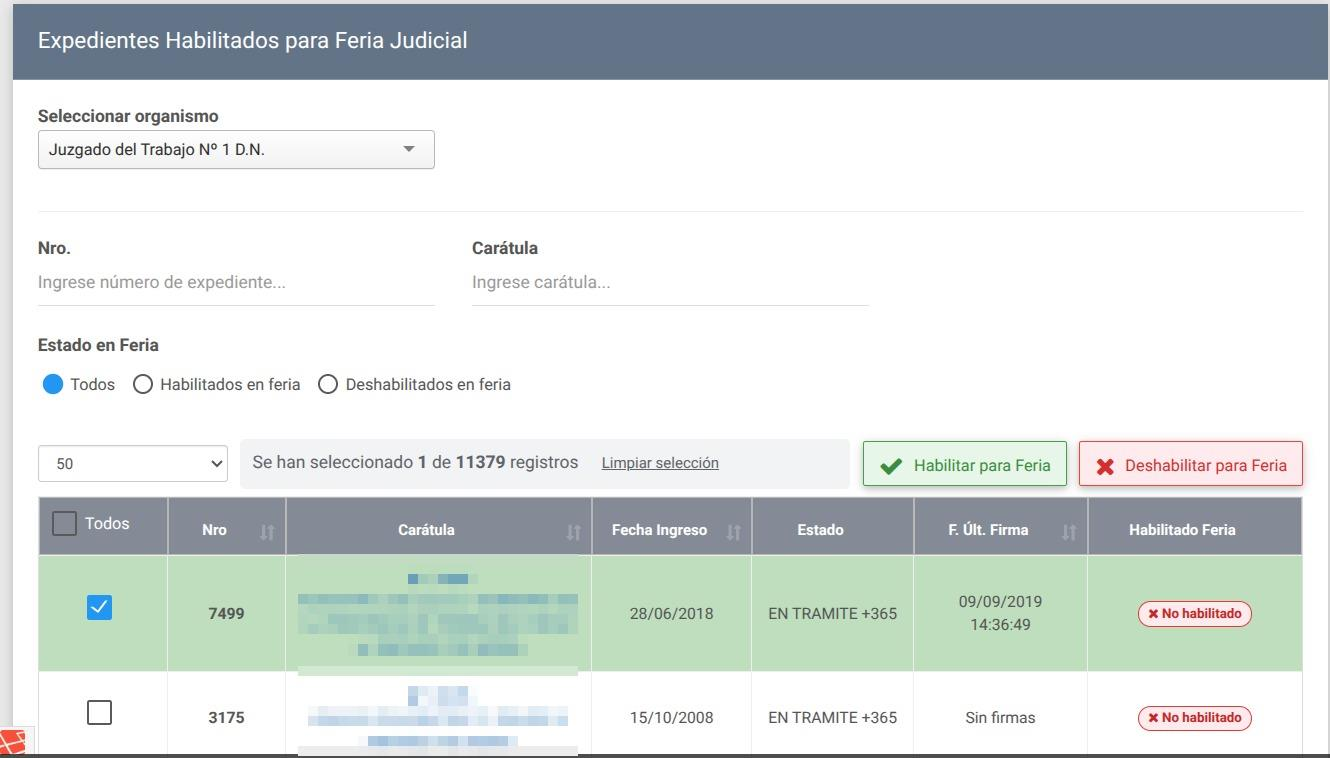 Este apartado explica cómo habilitar o deshabilitar expedientes para que puedan ser gestionados durante la feria judicial, asegurando que solo las causas urgentes o habilitadas estén disponibles para su tramitación.