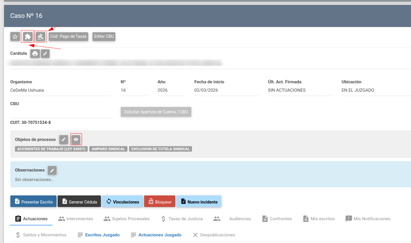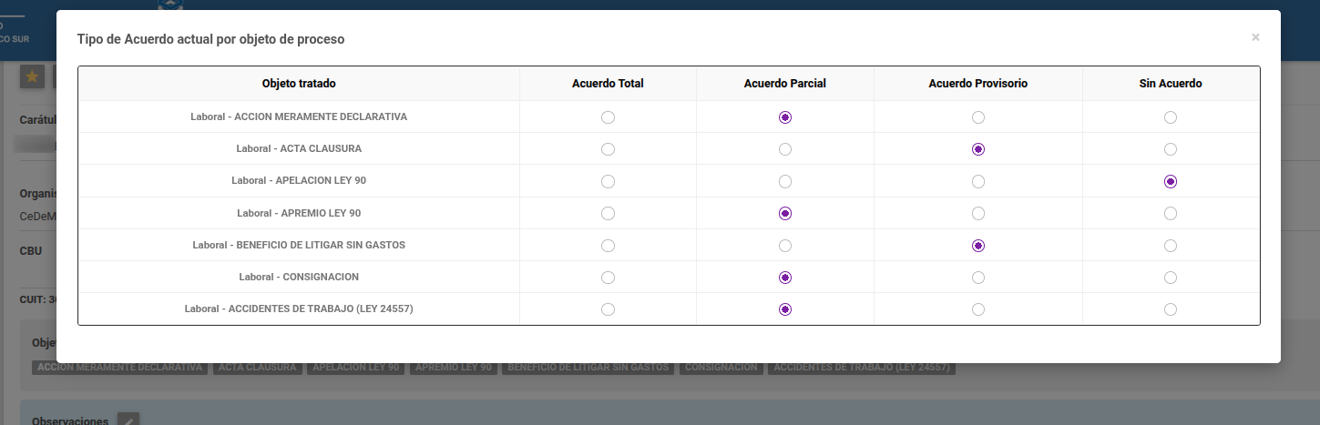 Dentro de la sección correspondiente a los Objetos del Proceso, se encuentran disponibles dos botones de acción. El primero permite la edición de los mismos; el segundo permite visualizar el tipo de acuerdo actualmente asignado a cada objeto procesal que haya sido tratado en alguna audiencia.