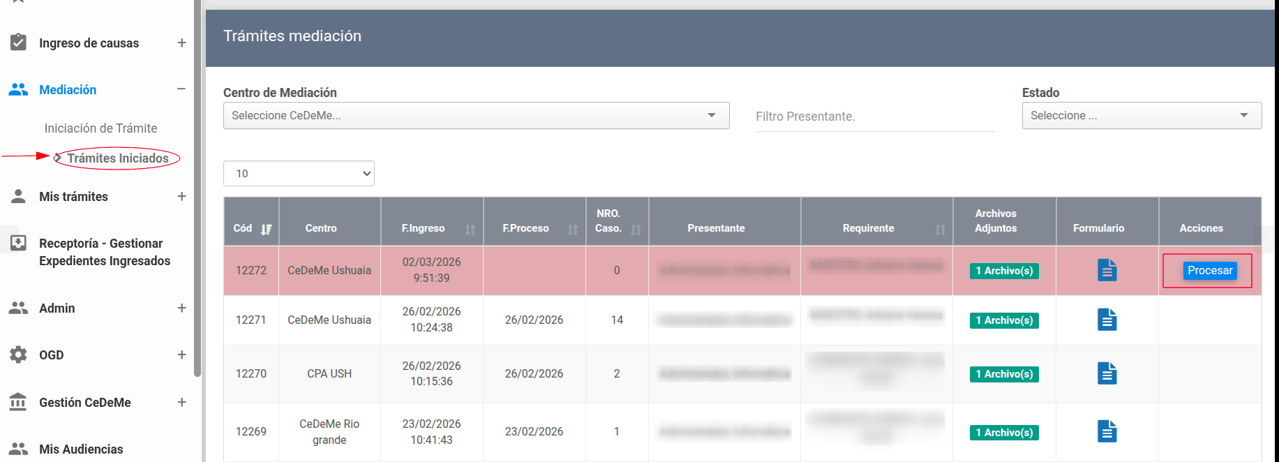 Aquellos registros cuya fila se visualiza en color rojo corresponden a trámites que aún no han sido procesados. Estos cuentan, en la columna “Acciones”, con un botón denominado “Procesar”. Al accionar dicho botón, el trámite será convertido en un Caso de Mediación dentro del sistema. Por el contrario, los registros que no disponen de dicho botón corresponden a trámites que ya han sido procesados y que, en consecuencia, cuentan con su respectivo Caso generado.